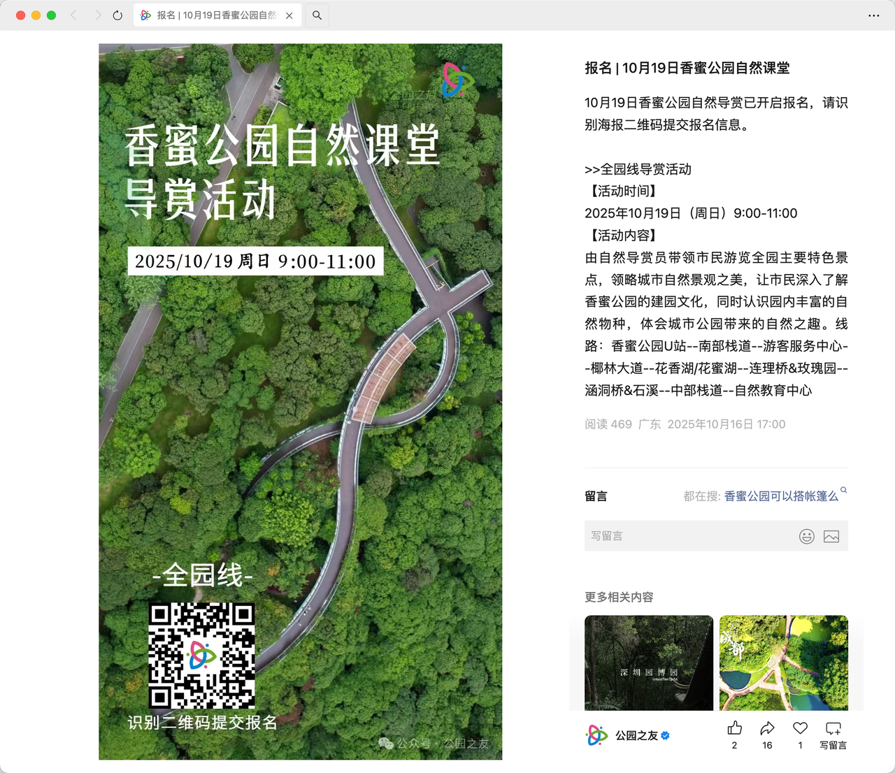 香蜜公园开园后,导赏活动正式上线。导赏员们带着市民认识植物、观察昆虫,分享园林知识,从那以后,导赏活动成了香蜜公园最受欢迎的项目之一。自 2017 年开园以来,在每个周末或节假日期间持续开展。